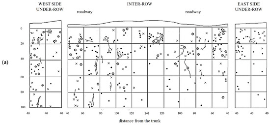 After soil sampling, a second replicate was performed for each trench, which was at least 0.3 m from the first, to better describe the soil profiles affected by coring and closer to the under-row (Figure 3). The spatial distribution of roots was analyzed as previously described.