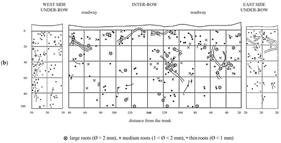 MT soil profiles showed a uniform root distribution throughout the trench. Large roots (diameter >2 mm) were even found in the central area of the inter-row, which was located at the greatest distance from the trunks. Along the soil profile, the roots uniformly colonized the soil layers between 10 and 60–80 cm deep, while in deeper layers, their presence consistently decreased, almost disappearing eventually. In the weeded area of the under-row, the vine roots also colonized the first 10 cm of depth. Thin roots predominated at all depths, while medium and large roots were evenly distributed in the first 60 cm of depth. In the under-row, medium and large roots were concentrated in the first 40 cm. Note the presence of a large root placed about 60 cm deep, reaching the bottom of the profile and crossing an area characterized by the total absence of roots (Figure 5).