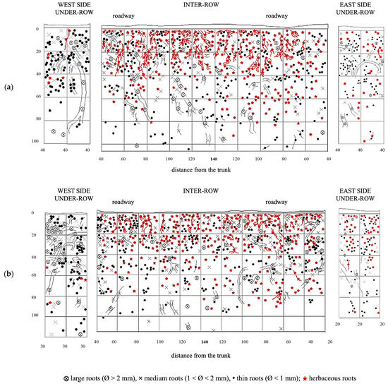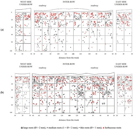 Map of soil depth and the radical distribution of grapevine and herbaceous plants registered in minimum-tilled (MT) plots. (a) First replicate; (b) second replicate.
