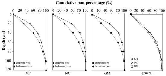 Cumulative root distribution between the inter-row and under-row of vine and herbaceous plants under different inter-row soil management techniques: minimum tillage (MT), natural covering (NC), and commercial grass mixture (GM). The final graph compares the cumulative percentage of vine root distribution under the three inter-row soil management techniques.