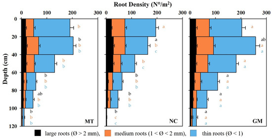Vertical distribution of vine root density across the soil profile, categorized by root diameter (large, medium, and thin under different inter-row soil management techniques: minimum tillage (MT), natural covering (NC), and commercial grass mixture (GM)). Vertical bars represent the standard error of the mean (SE). In cases of significant ANOVA results, different letters of the same color indicate differences among root diameter classes between treatments, with a p-value ≤ 0.05 (t-test).