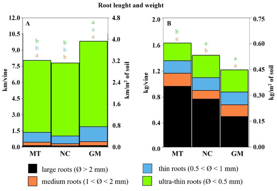 Vine root length (A) and dry weight (B), categorized by root diameter classes under different inter-row soil management techniques: minimum tillage (MT), natural covering (NC), and commercial grass mixture (GM). In cases of significant ANOVA results, different letters of the same color indicate differences among root diameter classes between treatments, with a p-value ≤ 0.05 (t-test).