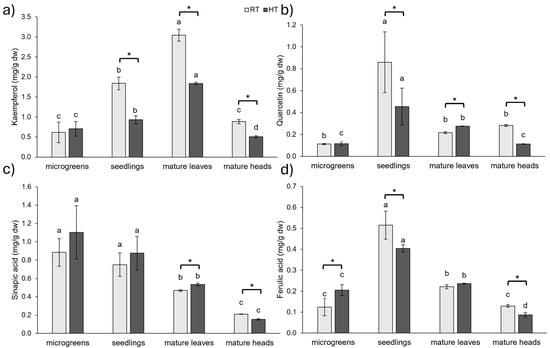 The concentration of (a) kaempferol, (b) quercetin, (c) sinapic acid, and (d) ferulic acid during development and in different organs at the mature stage of broccoli (Brassica oleracea var. cymosa) grown at room (RT) or high (HT) temperature. Values represent the mean ± standard deviation of three (mature plants) or six (microgreens, seedlings) biological replicates and four technical replicates. An asterisk (*) indicates a significant difference between plants grown at HT and RT within the same developmental stage or organ at the mature stage (Student’s t-test, p ≤ 0.05), while different letters indicate significant differences among developmental stages or organs grown under the same temperature conditions (one-way ANOVA, Duncan’s test, p ≤ 0.05).
