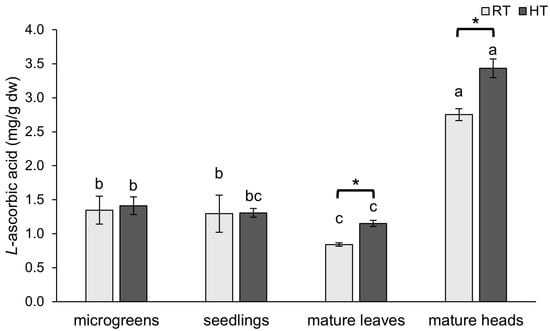The concentration of L-ascorbic acid during development and in different organs at the mature stage of broccoli (Brassica oleracea var. cymosa) grown at room (RT) or high (HT) temperature. Values represent the mean ± standard deviation of three (mature plants) or six (microgreens, seedlings) biological replicates and four technical replicates. An asterisk (*) indicates a significant difference between plants grown at HT and RT within the same developmental stage or organ at the mature stage (Student’s t-test, p ≤ 0.05), while different letters indicate significant differences among developmental stages or organs grown under the same temperature conditions (one-way ANOVA, Duncan’s test, p ≤ 0.05).