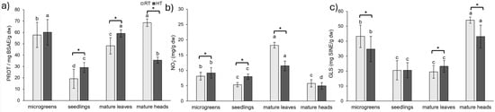 The concentration of (a) soluble proteins (PROT), (b) total nitrates (NO3−), and (c) total intact glucosinolates (GLS) during development and in different organs at the mature stage of broccoli (Brassica oleracea var. cymosa) grown at room (RT) or high (HT) temperature. Values represent the mean ± standard deviation of three (mature plants) or six (microgreens, seedlings) biological replicates and four technical replicates. An asterisk (*) indicates a significant difference between plants grown at HT and RT within the same developmental stage or organ at the mature stage (Student’s t-test, p ≤ 0.05), while different letters indicate significant differences among developmental stages or organs grown under the same temperature conditions (one-way ANOVA, Duncan’s test, p ≤ 0.05). BSAE = bovine serum albumin equivalents; SINE = sinigrin equivalents.