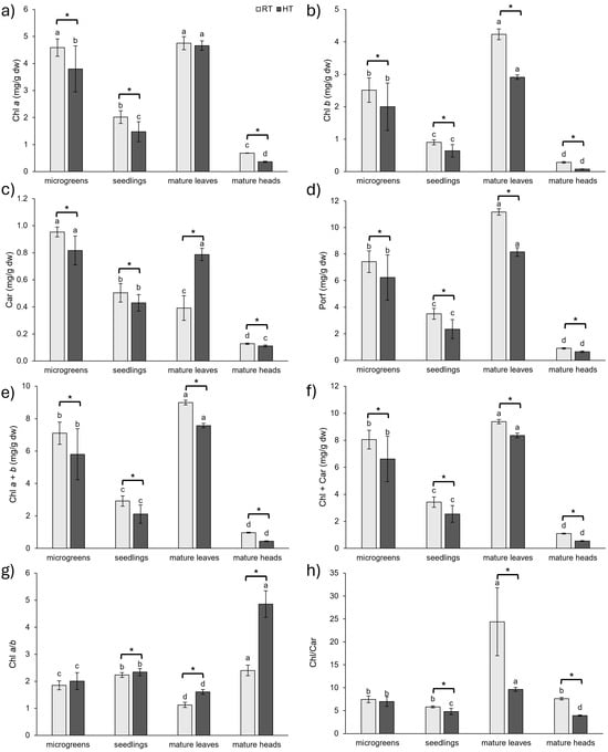 The concentration of (a) chlorophyll a, (b) chlorophyll b, (c) carotenoids (Car), (d) porphyrins (Porf), (e) total chlorophyll (Chl), (f) total chlorophyll and carotenoid, the ratio of (g) chlorophyll a/b, and (h) total chlorophyll/total carotenoids during development and in different organs at the mature stage of broccoli (Brassica oleracea var. cymosa) grown at room (RT) or high (HT) temperature. Values represent the mean ± standard deviation of three (mature plants) or six (microgreens, seedlings) biological replicates and four technical replicates. An asterisk (*) indicates a significant difference between plants grown at HT and RT within the same developmental stage or organ at the mature stage (Student’s t-test, p ≤ 0.05), while different letters indicate significant differences among developmental stages or organs grown under the same temperature conditions (one-way ANOVA, Duncan’s test, p ≤ 0.05).