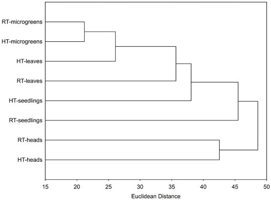 Hierarchical clustering analysis showed groupings of samples according to developmental stage (and the organ at the mature stage) and temperature conditions (Figure 9). The two temperature groups of the microgreens stage were the nearest, with the smallest differences caused by temperature. Within the developmental stage, the two temperature groups of seedlings were the most distant. This suggests that the seedlings most significantly reacted to HTs. Out of all developmental stages/organs, heads of mature broccoli were the most distant from the others, indicating biochemical differences of this organ in comparison to other developmental stages.