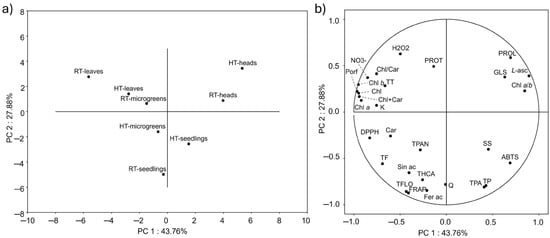 The principal component analysis showing (a) the relationship between different developmental stages and organs at the mature stage of broccoli (Brassica oleracea var. cymosa) grown at room (RT) and high (HT) temperature based on the analyzed variables, with the grouping displayed in part (b) of the figure. ABTS = 2,2′-azino-bis(3-ethylbenzothiazoline-6-sulfonic acid); Car = carotenoids; Chl = chlorophyll; DPPH = 2,2-diphenyl-1-picrylhydrazyl; Fer ac = ferulic acid; FRAP = ferric ion-reducing antioxidant power; GLS = total intact glucosinolates; H2O2 = hydrogen peroxide; HT = high temperature; K = kaempferol; L-asc = L-ascorbic acid; NO3− = total nitrates; Porf = porphyrins; PROL = proline; PROT = soluble proteins; Q = quercetin; RT = room temperature; Sin ac = sinapic acid; SS = soluble sugars; TF = total flavonoids; TFLO = total flavonols; THCA = total hydroxycinnammic acids; TP = total phenolics; TPA = total phenolic acids; TPAN = total proanthocyanidins; TT = total tannins.
