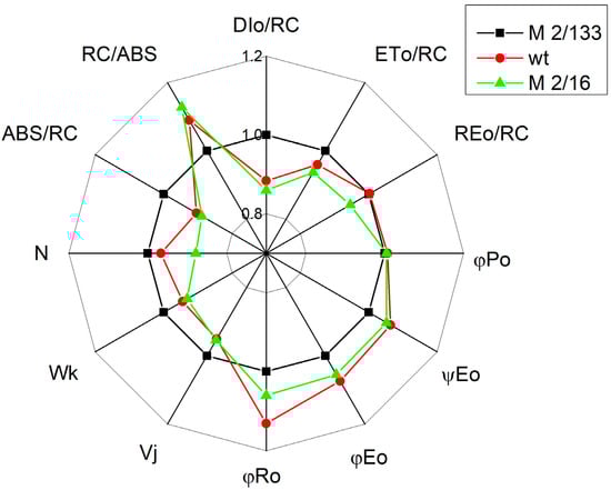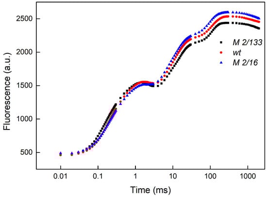 The representative OJIP chlorophyll a fluorescence curves in Borec wild type (wt) and its mutants Costata 2/133 (M 2/133) and Coeruleovireus 2/16 (M 2/16). (for measurement details see Section 4).
