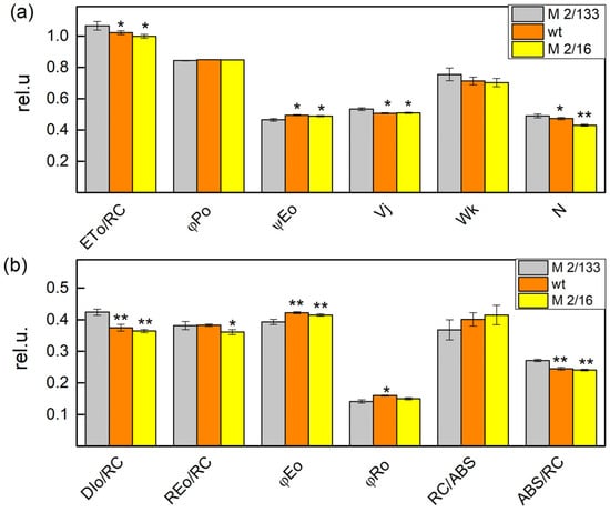 Selected JIP parameters in Borec wild type and its mutants Costata 2/133 (M 2/133) and Coeruleovireus 2/16 (M 2/16). The parameters include the following: ETo/RC—electron transport flux further QA− per reaction center; φPo—maximum quantum yield of primary photochemistry; ψEo—the efficiency of electron transport beyond QA; Wk—the stability of the OEC; Vj—the fraction of closed reaction centers at the J-step in the chlorophyll a fluorescence curve; ABS/RC (×101)—absorption per reaction center; RC/ABS—the ratio of active reaction centers per absorbed light; DIo/RC—light energy dissipation; φEo—the quantum yield of electron transport beyond QA; φRo—the quantum yield of energy dissipation in the form of heat and fluorescence at the reaction center level; REo/RC—electron flux reducing end electron acceptors at the PSI acceptor side per reaction center; and N (×102)—maximum turnover of QA reducing until Fm was reached. Significant differences between the plant with the lowest degree of LHCII oligomerization (M 2/133) and plants with a higher degree of oligomerization (wt and M 2/16) were determined by Student’s t tests and are indicated by asterisks at p values less than 0.05 (*), 0.01 (**). (a) parameters: ETo/RC, φPo; ψEo, Vj, Wk, N; (b) parameters: Dio/RC, φEo, φRo, RC/ABS, ABS/RC.