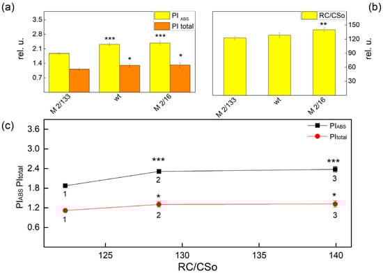 Performance indices PIABS and PItotal (a), the amount of active PSII per excited cross-section reaction center (RC/CSo), (b) in Borec wild type and its mutants Costata 2/133 and Coeruleovireus 2/16. The relationship between the amount of active PSII per excited cross-section reaction center (RC/CSo) on the performance indices PIABS and PItotal. (c) 1, 2, 3 correspond with Costata 2/133, Borec wt, and Coeruleovireus 2/16, respectively. Significant differences between the plant with the lowest degree of LHCII oligomerization (M 2/133) and plants with a higher degree of oligomerization (wt and M 2/16) were determined by Student’s t test and are indicated by asterisks at p values less than 0.05 (*), 0.01 (**), and 0.001 (***).