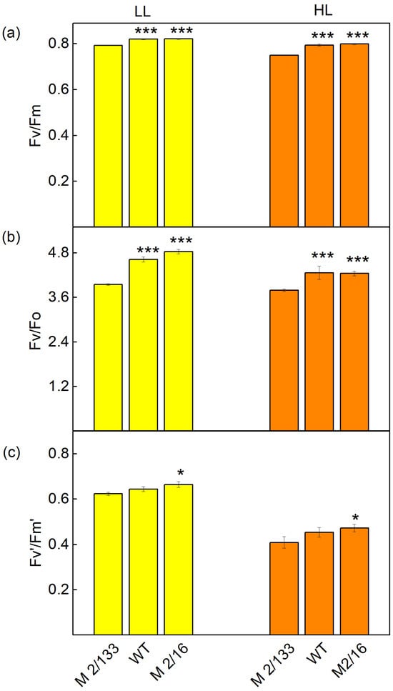 The parameters of PAM chlorophyll a fluorescence in Borec wild type (wt) and its mutants Costata 2/133 (M 2/133) and Coeruleovireus 2/16 (M 2/16) at low light (LL, 150 μmol photons/m2·s actinic light) and high light (HL, 500 μmol photons/m2·s actinic light: (a) the maximal quantum yield) in dark-adapted state (Fv/Fm); (b) the intensity of chlorophyll a fluorescence caused by photochemical processes to intensity of the chlorophyll a fluorescence not excitonically bound to the reaction centers of PSII (Fv/Fo); (c) the effective quantum yield of PSII photochemistry (Fv′/Fm′). Significant differences between the plant with the lowest degree of LHCII oligomerization (M 2/133) and plants with a higher degree of oligomerization (wt and M 2/16) were determined by Student’s t tests and are indicated by asterisks at p values less than 0.05 (*) and 0.001 (***).
