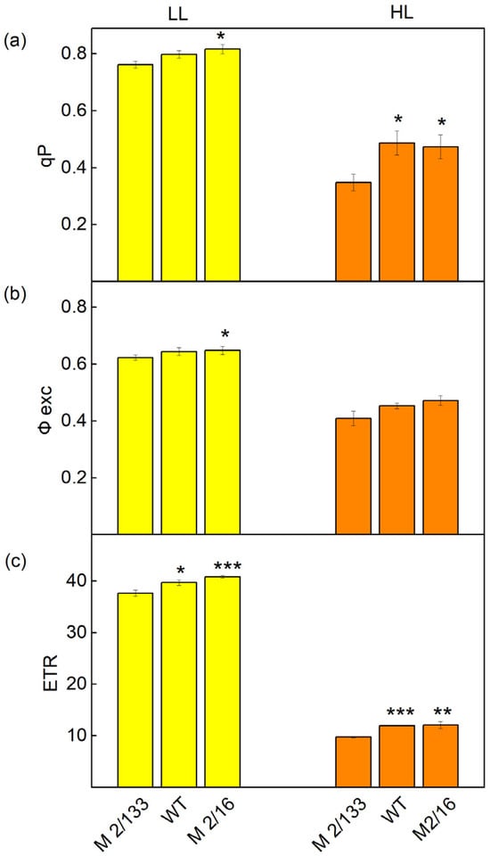 Differences in the organization of the photosynthetic apparatus also affect the following: the effective quantum yield of PSII photochemistry (Fv′/Fm′), photochemical quenching (qp), excitation efficiency of open PSII center (Φexc), and linear electron transport rate (ETR). At low light (LL), a slight increase in Fv′/Fm′ (by 3–6%), qp (by 5–7%), and Φexc (by 4%) were registered in wt and mutant 2/16 in comparison to the mutant 2/133 (Figure 5 and Figure 6). The differences between studied plants were bigger at HL. The photochemical quenching (qp) was higher from 36% to 40% and ETR from 20% to 21% in wt and mutant 2/16 than the values of these parameters in mutant 2/133. The parameters Φexc and Fv′/Fm′ were bigger by 11–13% in wt and mutant 2/16 than in mutant 2/133 (Figure 6).