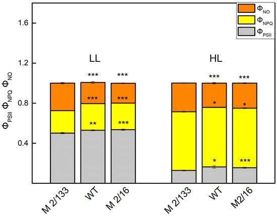 The energy absorbed by PSII is the sum of yields of photochemical energy conversion in PSII (ΦPSII), regulated (ΦNPQ), and non-regulated energy losses (ΦNO) [34]. At LL, the parameter ΦPSII was higher (5–8%) in plants with higher degree of oligomerization of LHCII (wt and mutant 2/16) than in the mutant 2/133 (Figure 7). At the same time, ΦNO was smaller (by about 25%), while ΦNPQ was bigger (by about 20%) in leaves of wt and mutant 2/16 in comparison to those in the mutant 2/133 (Figure 7).