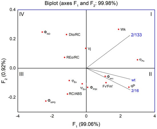 The first two components (Figure 8 and Table S1) account for 99.98% of the variability in the data. The pea mutant with the lowest oligomerization of LHCII complexes (mutant 2/133), positioned in the first quadrant, exhibits a negative correlation/relationship with parameters related to the number of active reaction centers per PSII antenna chlorophyll (RC/ABS), the quantum yield of electron transport (φEo), and the regulated energy losses from PSII (ΦNPQ), which are located in the third quadrant. Simultaneously, a more distinct positive correlation is observed in the mutant 2/133 for processes associated with non-photochemical quenching per reaction center unit (DIo/RC), nonregulated energy losses of PSII (ΦNO), and the stability of the OEC (Wk), all of which are located on the upper side of the F1 axis. In contrast, the mutant 2/16 and wt, located in the second quadrant and characterized by higher oligomerization of the LHII than mutant 2/133, show significantly improved photochemical activity, as indicated by the parameters in the same quadrant (Fv′/Fm′, Φexc, qp, ΦPSII).