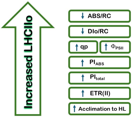 This study highlights the critical regulatory role of LHCII oligomerization in photosynthetic efficiency. The influence of the LHCII oligomerization on the light reaction of photosynthesis is summarized in Figure 9. The current study, for the first time, revealed that variations in LHCII organization significantly influence parameters such as energy absorption and electron transport efficiency. Increased LHCII oligomerization correlates with higher reaction center density and improved photosynthetic performance indices (PIABS and PItotal), which could be a result of an influence on the reoxidation of the QA−. Conversely, lower LHCII oligomerization is linked to increased energy dissipation and reduced electron transport efficiency. These findings suggest that LHCII’s structural organization plays a pivotal role in optimizing photosynthetic function under different environmental conditions. Insights into these mechanisms deepen our understanding of photosynthetic efficiency and its adaptation to abiotic factors. The conclusions regarding the role of LHCII oligomerization in the efficiency of the photosynthetic apparatus could be used to assess the possibility of evaluating the stability of new plant varieties in various environmental conditions.