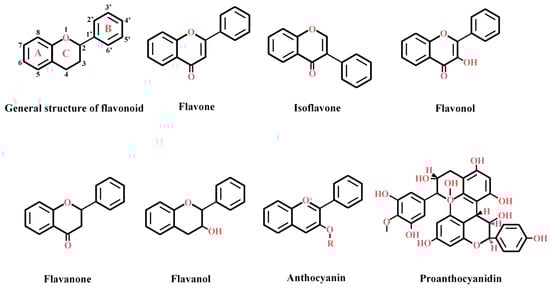 Flavonoids represent a major class of plant secondary metabolites synthesized through the phenylpropanoid metabolism pathway. To date, more than 9000 plant-derived flavonoid compounds have been isolated and structurally characterized [8]. Flavonoids are characterized by a basic structure consisting of a C6-C3-C6 carbon skeleton (Figure 1), which comprises two 6-carbon benzene rings (Ring A and Ring B) linked by a 3-carbon heterocyclic ring (Ring C) [9]. Based on the oxidation state of the 3-carbon heterocyclic ring and the number of substituents attached to the benzene ring, flavonoids can be broadly classified into seven subgroups: flavones, isoflavones, flavonols, flavanones, flavanols, anthocyanins, and proanthocyanidins (Figure 1). Flavonoids play crucial roles in plant growth and development. For example, flavones contribute to drought resistance and protect plants from UV-B radiation [10]. Flavonols have been demonstrated to be essential for pollen germination and pollen tube formation [11] and regulate the polar transport of auxin by mediating the stabilization of PIN efflux complexes [12]. Anthocyanins, a class of naturally occurring water-soluble pigments, are widely distributed in the vacuoles of flowers, fruits, stems, and leaves, exhibiting diverse biological activities such as free radical scavenging [13].
