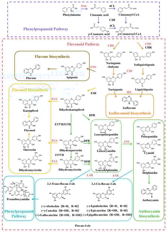 The biosynthesis pathways of flavonoids in plants. Flavonoid biosynthesis consists of two parts: the early phenylpropanoid pathway and the flavonoid biosynthesis pathway. The enzymes highlighted in red in the figure are rate-limiting enzymes. The enzyme abbreviations are as follows: PAL, phenylalanine ammonia-lyase; C4H, cinnamic acid 4-hydroxylase; 4CL, 4-coumarate-CoA ligase; CHS, chalcone synthase; CHR, chalcone reductase; CHI, chalcone isomerase; IFS, isoflavonoid synthase; FNS, flavone synthase; F3H, flavanone 3-hydroxylase; FLS, flavonol synthase; F3′5′H, flavonoid 3′,5′-hydroxylase; F3′H, flavonoid 3′-hydroxylase; DFR, dihydroflavonol 4-reductase; ANS, anthocyanidin synthase; LAR, leucoanthocyanidin reductase; ANR, anthocyanidin reductase.