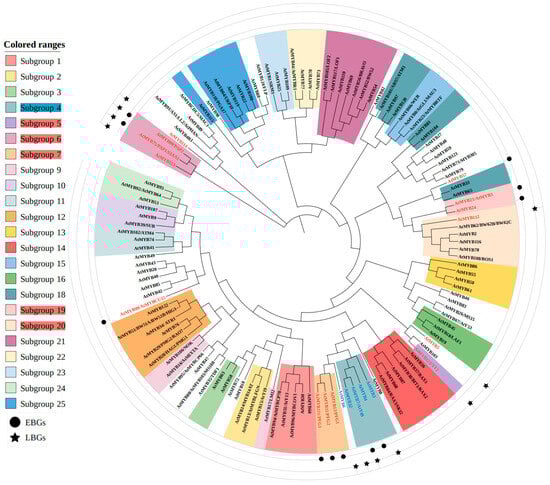 The R2R3-MYB subfamily represents the predominant class of MYB transcription factors in plants, comprising 126 MYB proteins in A. thaliana (Figure 3). R2R3-MYB gene family has undergone significant functional diversification during evolution, resulting in distinct subgroups [23]. The canonical classification and nomenclature of R2R3-MYBs were initially established in A. thaliana, where early studies classified them into 25 subgroups [24]. Many of these subgroups function as transcriptional activators or repressors, directly or indirectly regulating the expression of flavonoid biosynthesis genes. However, over 30 R2R3-MYBs remain unclassified into any subgroup [23,24]. Notably, all members of R2R3-MYB Subgroup 5, 6, 7, and 19 are known to positively regulate flavonoid biosynthesis, while AtMYB112 from Subgroup 20 also participates in flavonoid production [25,26,27,28,29,30]. In contrast, R2R3-MYB Subgroup 4 acts as a repressor of flavonoid biosynthesis [31]. Additionally, several unclassified R2R3-MYBs, including AtMYB5, AtMYB6, AtMYB57, AtMYB99, and AtMYB114, have been demonstrated to modulate flavonoid accumulation [27,29,32,33,34].