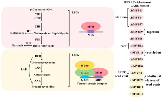 The flavonoid biosynthesis pathway can be divided into two major phases regulated by early biosynthetic genes (EBGs) and late biosynthetic genes (LBGs) (Figure 4). EBGs primarily include genes such as CHS, CHI, F3H, and FLS, which are involved in the synthesis of isoflavones, flavones, and flavonols, whereas LBGs mainly consist of DFR, ANR, and ANS, which regulate the production of anthocyanins and proanthocyanidins. Taking A. thaliana as an example, MYB transcription factors containing the MYB structural domain can either independently regulate the expression of specific genes in the flavonoid biosynthetic pathway or collaboratively modulate flavonoid biosynthesis by forming the MYB-bHLH-WD40 (MBW) ternary complex with WD40 and bHLH proteins (Figure 4). The highly conserved MYB domain of MYB transcription factors binds to MYB binding sites (MBS) in the promoter regions of target genes. Previous studies have identified that R2R3-MYB transcription factors recognize MBS motifs, including AC-rich elements: 5′-ACC(A/T)A(A/C)-3′ (ACC element) and 5′-(C/T)AACNG-3′ (AAC element), as well as the GARE cis-acting element TTGTTA [29,35,36]. The G-box element CACGTG serves as the binding site for bHLH transcription factors that regulate flavonoid biosynthesis [37].