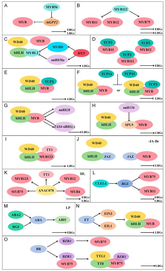 Alternative ways of regulating flavonoid biosynthetic pathways. (A) AtMYB56 regulates flavonoid biosynthesis by modulating AtGPT2; (B) AtMYB112 promotes anthocyanin biosynthesis by activating PAP1, while suppresses flavonol synthesis through inhibiting AtMYB12 and AtMYB111; (C) The regulatory control systems of AtHY5-AtMYBD-AtMYBL2 and AtHY5-miR858a-AtMYBL2 for promoting anthocyanin biosynthesis; (D) TCP3 interacts with AtMYB11, AtMYB12, and AtMYB111 to form binary complexes that promote flavonol biosynthesis; (E) TCP3 promotes flavonoid biosynthesis by stabilizing the MBW ternary complex; (F) TCP14 and TCP15 indirectly regulate flavonoid biosynthesis; (G) MiR828 and TAS4-siRNA81(-) reduce anthocyanin biosynthesis by targeting MYB transcription factors; (H) MiR156 negatively regulates anthocyanin accumulation by targeting SPL9 to disrupt the MBW ternary complex; (I) TT1 interacts with AtMYB123 to promote PAs accumulation; (J) In the absence of JA-Ile, JAZ proteins inhibit anthocyanin biosynthesis by interfering with the interaction between bHLHs and AtMYB75; (K) Under HL conditions, ANAC078 promotes flavonoid biosynthesis by regulating AtMYB75, AtMYB123, TT1, AtMYB12, and AtMYB4; (L) CLEL6 inhibits anthocyanin biosynthesis by regulating AtMYB75 and AtMYB11 through RGI receptors; (M) Under LP conditions, ABA promotes flavonoid biosynthesis through the transcription factor ABI5; (N) ET suppresses anthocyanin accumulation by acting on the MBW complex through transcription factors EIN3 and EIL1; (O) BR promotes flavonoid biosynthesis by regulating AtMYB75 and the MBW complex through transcription factor BZR1. In the figure, arrows indicate promotion, hammerheads indicate inhibition, and dashed lines indicate indirect regulation.