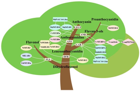 Anthocyanins are natural water-soluble pigments that are widely distributed in various tissues and organs of higher plants, providing vibrant colors and playing critical roles in physiological processes related to plant growth and development [71]. Proanthocyanidins (PAs), another class of flavonoids, primarily function as a defense mechanism against a broad range of biotic and abiotic stresses, exhibiting diverse biological activities and beneficial functions [71]. In plants, the biosynthesis of anthocyanins and PAs shares a common early pathway, both originating from the substrate phenylalanine, which undergoes enzymatic catalysis to produce leucoanthocyanidins. Subsequently, leucoanthocyanidins serve as the first metabolic branch point in both anthocyanin and PA biosynthetic pathways, under catalysis by LAR, they are converted to (+)-catechins, while ANS mediates their transformation into anthocyanidins. The resultant anthocyanidins can be further modified by ANR to yield (−)-epicatechins. The condensation of (+)-catechins and (−)-epicatechins ultimately generates proanthocyanidin polymers. Furthermore, anthocyanidins possess glycosylation potential and can be stabilized through the activity of UDP-glucose: flavonoid-3-O-glucosyltransferase (UFGT), forming more stable anthocyanin glycosides [72]. Consequently, metabolic competition exists between the anthocyanin and PA biosynthetic pathways for two key substrates: leucoanthocyanidins and unstable anthocyanidins (Figure 6).