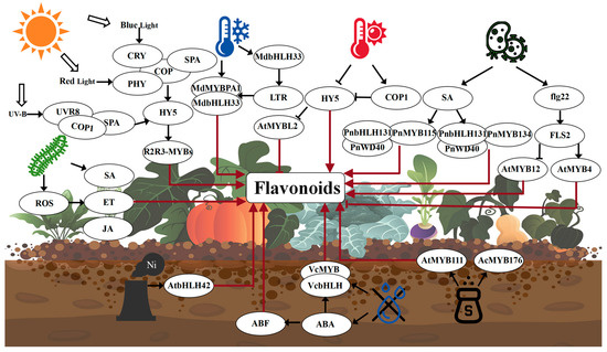 Heavy metal stress imposes multiple detrimental effects on plants, including inhibited cell growth, chlorophyll degradation, impaired photosynthesis and respiration, nutrient consumption, lipid peroxidation, and membrane disintegration, ultimately leading to compromised crop growth or even mortality [94]. Plants can detoxify toxic metal(loid)s by accumulating various metabolites. Beyond scavenging excess reactive oxygen species (ROS) induced by metal(loid)s, certain metabolites can chelate metal(loid) ions [95]. The study found that anthocyanins can mitigate heavy metal toxicity in plants by scavenging free radicals, activating the antioxidant system, and chelating and sequestering heavy metals [94]. Nickel (Ni) is an essential element for plant growth and development, but excessive accumulation of Ni in soil can cause plant damage. Therefore, elucidating the molecular mechanisms underlying plant resistance to Ni stress is imperative. Studies have revealed that in A. thaliana, TT8 (AtbHLH42) acts as a positive regulator in response to Ni stress by upregulating six flavonoid biosynthetic enzyme-coding genes (CHS, CHI, F3H, F3′H, DFR, and FLS). This transcription factor participates in transcriptional regulation cascades during Ni stress response and promotes anthocyanin biosynthesis [96]. Cadmium (Cd), a predominant soil pollutant primarily derived from nonferrous metal smelting processes, exerts toxic effects on agricultural soils. Studies have identified that various flavonoid compounds and flavonoid metabolic genes are upregulated in plants under Cd stress [97]. Furthermore, genes associated with the metabolism of abscisic acid, brassinosteroid, ethylene, cytokinin, and jasmonate were all upregulated by Cd [97]. This suggests that flavonoid synthesis in Cd-stressed plants may be induced through endogenous hormones and signal transduction pathways.