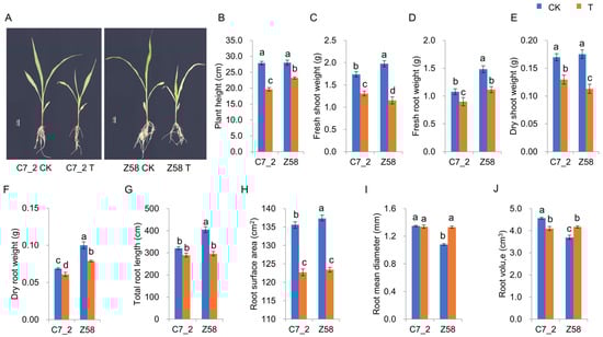 The morphological changes in C7_2 and Z58 under Cd stress. (A) Morphology of Z58 and C7_2 for 14-day-old seedlings. (B–J) Analysis of morphological traits for C7_2 and Z58. Different characters indicate significant differences at p value < 0.05 (n = 5).