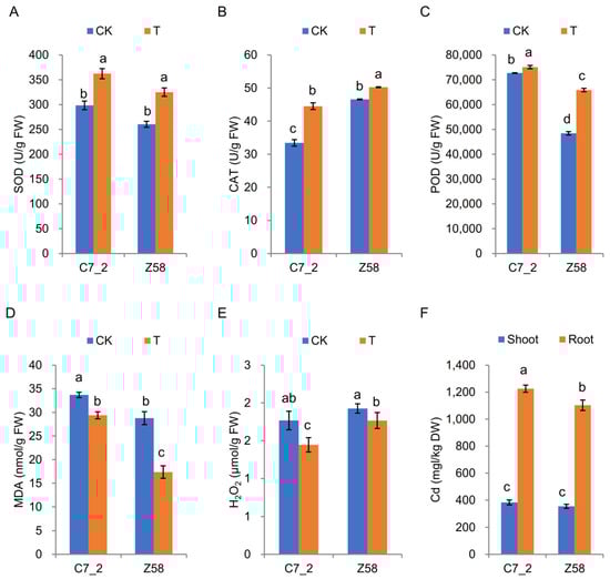 The SOD, POD, and CAT activity and MDA, H2O2, and Cd content changes in C7_2 and Z58 under Cd stress. (A) SOD. (B) POD. (C) CAT. (D) MDA. (E) H2O2. (F) Cd. The different characters indicate significant differences at p < 0.05 level (n = 5).