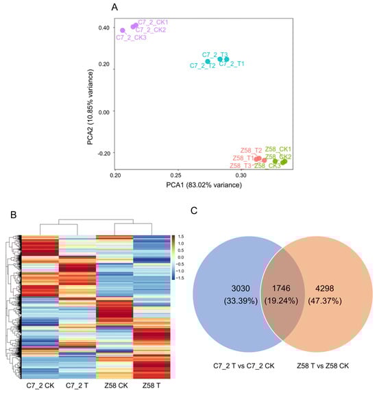 Analysis of transcriptome data for C7_2 and Z58 under CK and Cd stress. (A) PCA of the gene expression patterns of C7_2 and Z58 under CK and Cd treatment. The X axis represents PCA1 (83.02% variance), and the Y axis represents PCA2 (10.85% variance). Each sample has three biological duplicates and is represented on the plot by a unique symbol. (B) Heatmap of the gene expression patterns of C7_2 and Z58 under CK and Cd treatment. (C) Venn diagram of the DEGs in C7_2 T vs. C7_2 CK and Z58 T vs. Z58 CK.