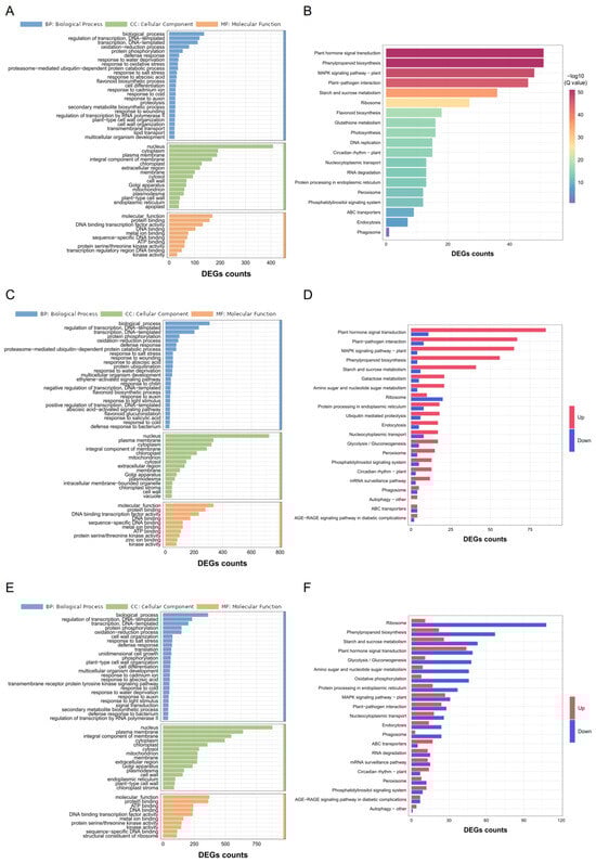 GO and KEGG_enrichment analysis for the DEGs of C7_2 and Z58 under Cd stress. (A) GO analysis for the 1746 common DEGs of C7_2 and Z58. (B) KEGG analysis for the 1746 common DEGs of C7_2 and Z58. (C) GO analysis for the 3030 unique DEGs in C7_2. (D) KEGG analysis for the 3030 unique DEGs in C7_2. (E) GO analysis for the 4298 unique DEGs in Z58. (F) KEGG analysis for the 4298 unique DEGs in Z58.
