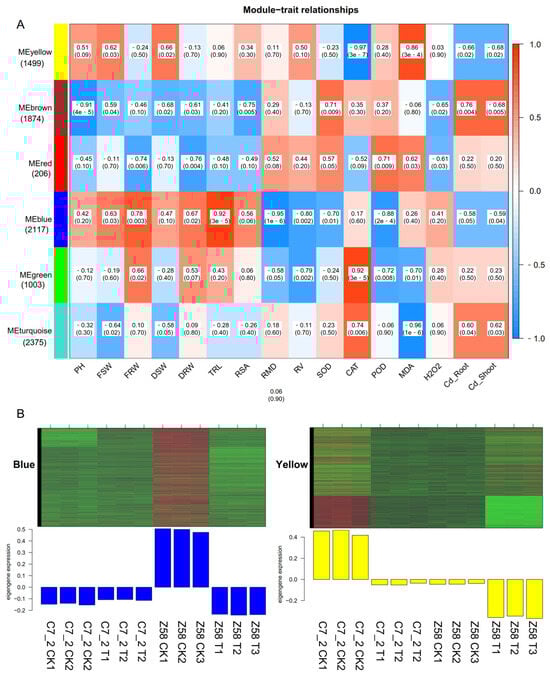 Identification of gene networks related to Cd stress in C7_2 and Z58. (A) Module–trait relationships of modules and the morphological and physiological traits. The horizontal coordinate represents different traits, the vertical coordinate represents different modules, and the filling value represents the correlation size and the statistical test p value. The closer the correlation value is to 1 or −1, the stronger the positive or negative correlation between the module and the samples. The smaller the p value in parentheses, the stronger the significance. (B) Heatmap of the blue and yellow module genes. The upper part is the heat map of gene expression within the modules, and the lower part is the bar plot of the expression of module eigengenes in each sample.