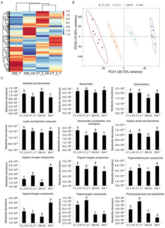 Analysis of metabolome data and metabolite content of C7_2 and Z58. (A) Cluster heat map analysis of DAMs. (B) Principal component analysis (PCA) of DAMs. (C) Differential metabolite content of 12 superclasses under Cd stress. The different characters indicate significant differences at a p < 0.05 level (n = 6).
