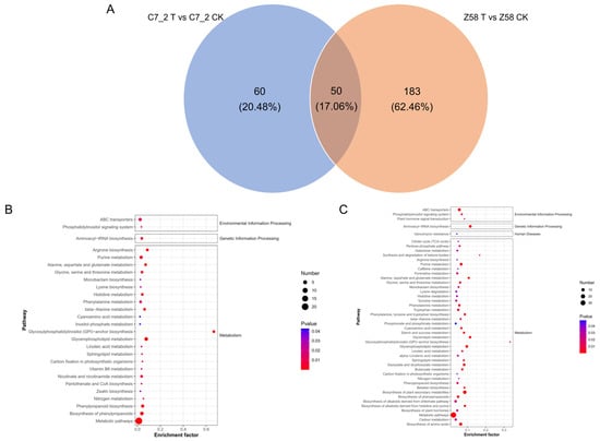 The Venn and KEGG pathway enrichment analysis for the DAMs of C7_2 and Z58. (A) Venn diagram analysis for the DAMs of C7_2 and Z58. (B) KEGG analysis for DAMs of C7_2 T vs. C7_2 CK. (C) KEGG analysis for DAMs of Z58 T vs. Z58 CK. The horizontal axis represents the enrichment ratio, while the vertical axis represents the enriched pathway name. The color scale indicates different thresholds of the p value, and the size of the dot indicates the number of metabolites corresponding to each pathway.