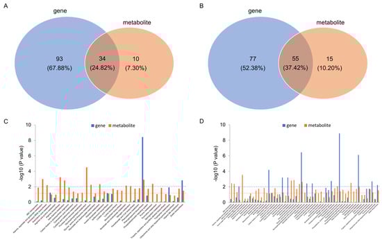 Analysis of KEGG enrichment pathways for the DEGs and DAMs of C7_2 and Z58. Venn diagram of KEGG enrichment pathways for the DEGs and DAMs of C7_2 (A) and Z58 (B). Bar plot of KEGG enrichment pathways for the DEGs and DAMs of C7_2 (C) and Z58 (D). The dashed blue and orange lines in (C,D) indicate the threshold value of KEGG enrichment pathways for DEGs and DAMs at p value < 0.01 and p value < 0.05, respectively.