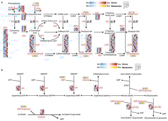 Integrated transcriptomic and metabolomic analysis for C7_2 and Z58 in phenylpropanoid biosynthesis and zeatin biosynthesis. (A) DEGs and DAMs of C7_2 and Z58 involved in phenylpropanoid biosynthesis. (B) DEGs and DAMs of C7_2 and Z58 involved in zeatin biosynthesis. The heatmap of (A,B) colored in blue and red indicates gene expression, and the heatmap of (A,B) colored in blue and orange indicates metabolite accumulation.