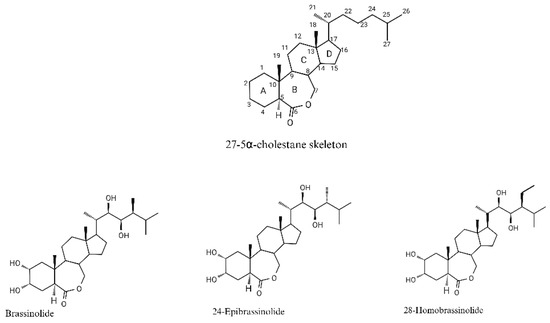 BRs are polyhydroxylated plant steroid hormones having a common C27-5α-cholestane skeleton, C28-BRs: 5α-ergostane, and C29-BRs: 5α-stigmastane [17]. The variation among them depends on the type and position of the functionalities in the A/B rings and the side chain [8]. BRs can be classified as C27, C28, or C29 compounds based on the alkyl substitutions in the side chain [10,18]. For the proper functioning of the BRs, oxygen at the C6 position and hydroxyl group on the side chain at the C22 and C23 positions are essential. Some low-abundance BRs bear oxygen at C3 and additional ones at one or more of the C2, C6, C22, and C23 carbon atoms [19]. The chemical structures of BRs that are biologically active and used in horticulture are shown in Figure 1.