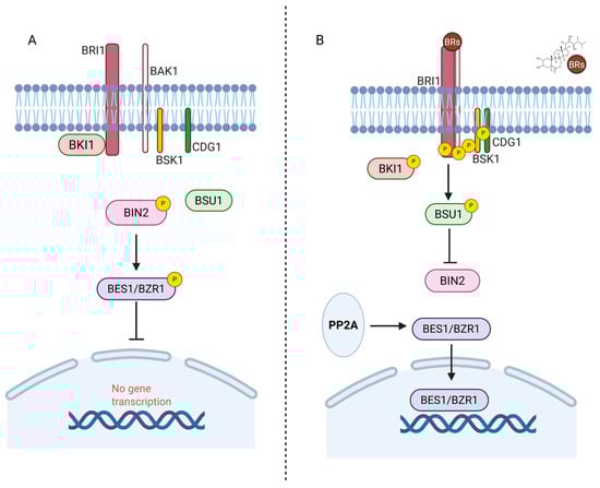 Brassinosteroid signaling pathway. (A) In the absence of BRs, the receptor complex remains inactive, and the kinase BIN2 phosphorylates the transcription factors BES1/BZR1, preventing their nuclear translocation and repressing BR-responsive gene expression. (B) In the presence of BRs, BRI1 forms an active receptor complex with co-receptors and initiates a phosphorylation cascade involving BSK1 and CDG1. This activates the phosphatase BSU1, which inactivates BIN2. Consequently, BES1/BZR1 are dephosphorylated by PP2A, accumulate in the nucleus, and activate BR-responsive gene expression. Image prepared.
