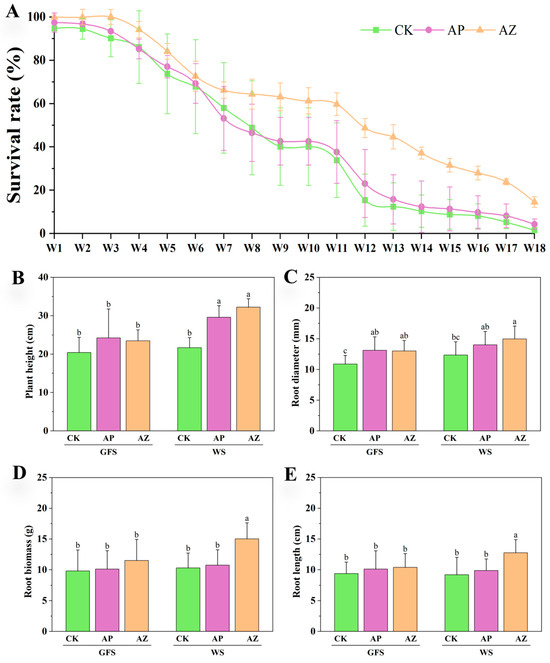 Survival rate and growth parameters of American ginseng under monoculture and intercropping conditions. CK, AP and AZ used in the graphs here and afterwards represented American ginseng (AG) plants under three cultivation systems. CK: American ginseng monoculture. AP: AG-perilla. AZ: AG-maize. In order to differentiate “AM” from the abbreviation of Arbuscular mycorrhizae, AM, we used AZ (AG-Zea mays) to replace the abbreviation of AG-maize, AM. X-axis in (A) referred to week after the investigation was initiated on 5 May. GFS: green fruit stage (19 July); WS: wither stage (1 September). (B) Plant height; (C) Root diameter; (D) Root biomass; (E) Root length. Different letters indicate significant differences among different treatments (p < 0.05).