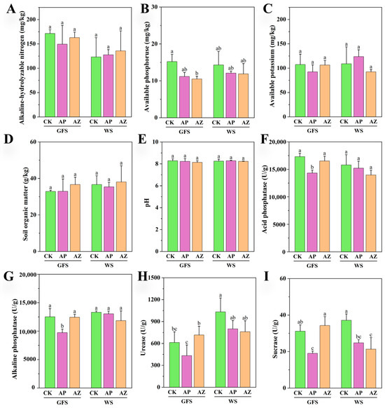Physicochemical properties and enzymatic activities of American ginseng rhizospheric soil. Different letters on the standard error in the subgraph indicated the significant difference of the measurements among two stages under the same cultivation system or at the same stage under two cultivation systems. (A) Alkaline-hydrolyzable nitrogen; (B) Available phosphoruse; (C) Available potassium; (D) Soil organic matter; (E) pH; (F) Acid phosphatase; (G) Alkaline phosphatase; (H) Urease; (I) Sucrase.