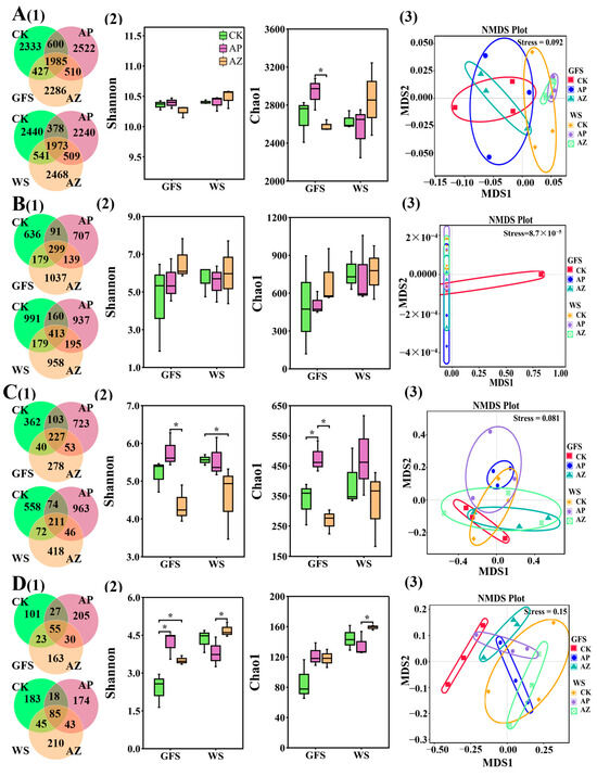 ASV distribution and microbial diversity of AG rhizosphere and root under different cropping systems. (A(1),B(1),C(1),D(1)) Venn diagrams showing ASVs shared or unique to CK, AG-perilla (AP), and AG-maize (AZ). (A(2),B(2),C(2),D(2)) Shannon and Chao1 indices showing α-diversity of microorganisms among CK, AG-perilla (AP), and AG-maize (AZ). (A(3), B(3), C(3),D(3)) NMDS plots showing β-diversity of microorganisms among CK, AG-perilla (AP), and AG-maize (AZ). (A) rhizosphere bacteria; (B) root bacteria; (C) rhizosphere fungi; (D) root fungi. * Significant difference in microbial α-diversity between two comparisons.