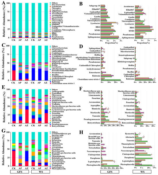 Changes of microbial genera in AG rhizosphere and root under different cropping systems. (A,C,E,G) relative abundance of the top 20 dominant microbial genera. (B,D,F,H) relative abundance s of representative genera. (A,B) rhizosphere bacteria, (C,D) root bacteria, (E,F) rhizosphere fungi, (G,H) root fungi. * p < 0.05, ** p < 0.01, *** p < 0.001 indicated the significant difference of microbial genus between two comparisons.