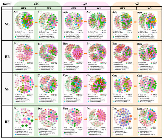 Co-occurrence networks of microbial communities in three cropping systems. (A) SB: rhizosphere bacteria; (B) RB: root bacteria; (C) SF: rhizosphere fungi; (D) RF: root fungi. (1) CK at green fruit stage; (2) CK at wither stage; (3) AG-perilla at green fruit stage; (4) AG-perilla at wither stage; (5) AG-maize at green fruit stage; (6) AG-maize at wither stage. Topological properties of microbial co-occurrence networks were listed in each subgraph. N: Number of nodes, each node represented a microbial species; L: No. of links (edges) between nodes; Edges represented significant correlations between two corresponding taxa (r > 0.6, p < 0.05) where Red and green indicated positive and negative correlations, respectively. Percentage of positive and negative correlations was indicated behind red and green line. The nodes of top 3 phyla were colored. Their percentage in all the phyla were showed in ().