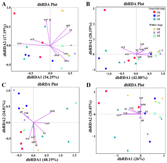 Redundancy analysis of microbial communities and environmental factors. (A) rhizosphere bacterial community; (B) root bacterial community; (C) rhizosphere fungi community; (D) root fungi community. SAN: soil Alkali-hydrolyzable nitrogen; SAP: soil available phosphorus; SAK: soil available potassium; SOM: soil organic matter; AKP: alkaline phosphatase; ACP: Acid phosphatase; UE: Urease; SC: Sucrase.