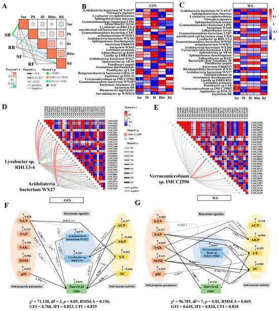 Keystone microbial species associated with survival rate and growth of American ginseng plant. (A) Mantel test visualizing the correlations between microbial communities with survival rate and growth of ginseng plant. Correlation heatmap of the top 30 bacterial species in AG-maize rhizosphere with survival rate and growth of ginseng plant at GFS (B) and WS (C). * on the heatmap indicated significant correlations. Mantel test visualizing the correlations between bacterial species with microbiome COG functional categories at GFS (D) and WS (E). Structural equation model (SEM) showing the effects of soil physicochemical properties, enzyme activities, and keystone bacterial species on survival rate of AG plant under maize companion planting condition at GFS (F) and WS (G) Numbers adjacent to arrows represented standardized path coefficients (* p < 0.05, ** p < 0.01, *** p < 0.001). Positive correlations were not marked; Negative correlations were marked “-“. Sur: survival rate. Ph: plant height. Rl: root length. Rbio: root biomass. Rd: root diameter. SAN: Alkali-hydrolyzable nitrogen. SAP: Available phosphorus. SAK: Available potassium. SOM: Soil organic matter. AKP: Alkaline phosphatase. ACP: Acid phosphatase. UE: Urease. SC: Sucrase. GFS: Green fruit stage. WS: wither stage. COG annotations were listed in Table S2.
