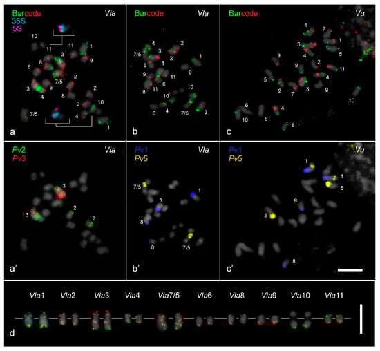 Oligo-FISH and chromosome painting based karyotyping of Vigna lasiocarpa (2n = 20) and V. unguiculata (2n = 22). (a) Barcode probes hybridized to V. lasiocarpa chromosomes, (a’) followed by a re-hybridization with P. vulgaris painting probes for chromosomes 2 (Pv2, green) and 3 (Pv3, red), enabling the identification of their putative homoeologs in V. lasiocarpa. (a) Both 5S (pseudo-colored in magenta) and 35S (pseudocolored in light blue) rDNA sites were mapped to a single chromosome Vla10, highlighted in the inserts. (b) The barcode probes hybridized to V. lasiocarpa chromosomes, (b’) followed by a re-hybridization with Pv1 (dark blue) and Pv5 (yellow) probes, allowing the identification of homoeologous chromosomes Vla1, Vla8, and the dysploid Vla7/5 chromosome. (c) Barcode probes hybridized to V. unguiculata chromosomes, (c’) followed by a re-hybridization using Pv1 (dark blue) and Pv5 (yellow) probes. All chromosomes were counter-stained with DAPI (pseudocolored in gray). (d) Karyogram of the barcode pattern in V. lasiocarpa (Vla), with the centromeres aligned along a gray line. Bars in (c’,d) = 5 µm.