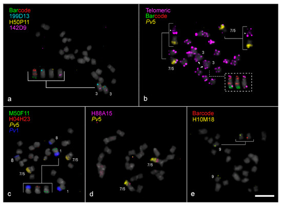 - de Oliveira Bustamante, F.; do Nascimento, T.H.; Montenegro, C.; Dias, S.; do Vale Martins, L.; Braz, G.T.; Benko-Iseppon, A.M.; Jiang, J.; Pedrosa-Harand, A.; Brasileiro-Vidal, A.C. Oligo-FISH barcode in beans: A new chromosome identification system. Theor. Appl. Genet. 2021, 134, 3675–3686. [Google Scholar] [CrossRef]