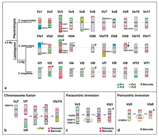In contrast, distinct FISH signal patterns were observed on the homoeologous V. unguiculata chromosomes 1, 3, 4, and 9, and particularly for chromosomes 5 and 7 (Figure 2 and Figure 3b–d). For example, the barcode FISH signal pattern on Vla4 was similar to Vl4, with one red and one green signal on each chromosome arm, but different from Vu4, which exhibited two green signals on the short arm and two red signals on the long arm (Figure 1a–c and Figure 3a). This pericentric inversion appears to be exclusive to V. unguiculata so far. The rearrangements involving the remaining chromosomes, which likely contributed to the genomic diversification and speciation of V. lasiocarpa, are illustrated schematically in Figure 3 and are further detailed in the following sections. The chromosomal positions of the probes in the three species are presented in Supplementary Table S1.