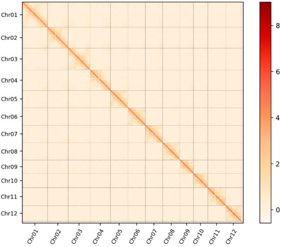 Hi-C interaction heatmap of the 1892S genome. Both the X and Y axes represent genomic positions divided into 100 kb bins (N × 100 kb), and each axis follows chromosome order from Chr01 to Chr12. Color gradients indicate the frequency of interaction between genomic regions, with darker colors indicating stronger chromatin contacts. Note: Although chromatin interaction frequencies in this map can reach values as high as 8, most visible intensities fall within the 2–3 range due to figure rendering limits. Strongest interactions are observed along the diagonal (i.e., between adjacent regions on the same chromosome), as expected. The lower interaction intensities in off-diagonal regions indicate minimal inter-chromosomal noise, which in turn reflects the high accuracy and contiguity of the T2T genome assembly.