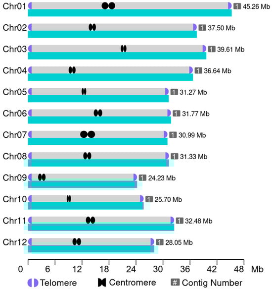 This figure illustrates an overview of the high-contiguity the genome assembly of the 1892S, in which each of the 12 chromosomes is assembled as a single contig without gaps. Telomeric repeat sequences have been identified at both ends of all chromosomes, and centromeric regions have been predicted based on repeat density and sequence characteristics.